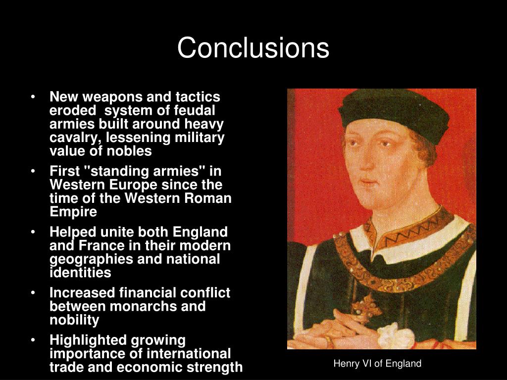 Conclusions • New weapons and tactics eroded system of feudal armies built around heavy cavalry, lessening military value of nobles • First "standing armies" in Western Europe since the time of the Western Roman Empire • Helped unite both England and France in their modern geographies and national identities • Increased financial conflict between monarchs and nobility • Highlighted growing importance of international trade and economic strength Henry VI of England
