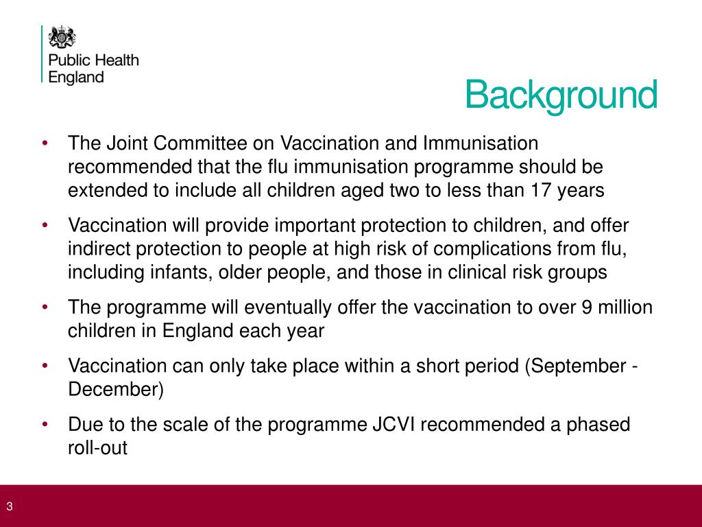 Background • The Joint Committee on Vaccination and Immunisation recommended that the flu immunisation programme should be extended to include all children aged two to less than 17 years • Vaccination will provide important protection to children, and offer indirect protection to people at high risk of complications from flu, including infants, older people, and those in clinical risk groups • The programme will eventually offer the vaccination to over 9 million children in England each year • Vaccination can only take place within a short period (September - December) • Due to the scale of the programme JCVI recommended a phased roll-out