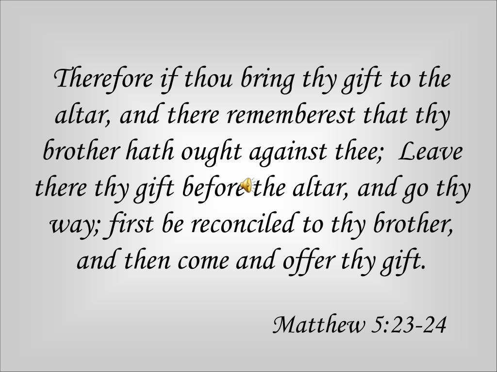 Therefore if thou bring thy gift to the altar, and there rememberest that thy brother hath ought against thee; Leave there thy gift before the altar, and go thy way; first be reconciled to thy brother, and then come and offer thy gift. Matthew 5:23-24