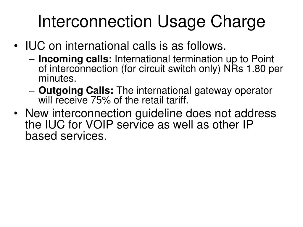 Interconnection Usage Charge • IUC on international calls is as follows. • Incoming calls: International termination up to Point of interconnection (for circuit switch only) NRs 1.80 per minutes. • Outgoing Calls: The international gateway operator will receive 75% of the retail tariff. • New interconnection guideline does not address the IUC for VOIP service as well as other IP based services.