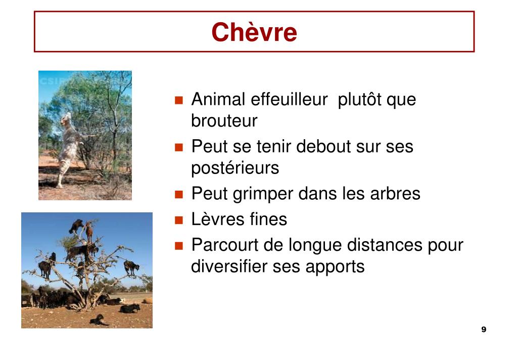 Chèvre • Animal effeuilleur plutôt que brouteur • Peut se tenir debout sur ses postérieurs • Peut grimper dans les arbres • Lèvres fines • Parcourt de longue distances pour diversifier ses apports