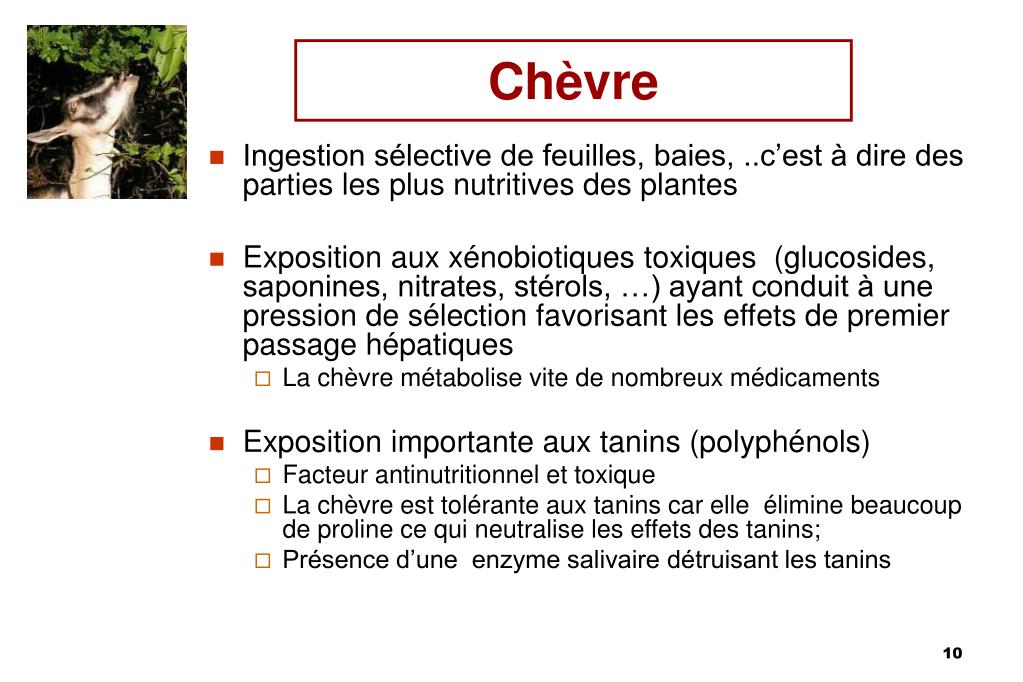 Chèvre • Ingestion sélective de feuilles, baies, ..c’est à dire des parties les plus nutritives des plantes • Exposition aux xénobiotiques toxiques (glucosides, saponines, nitrates, stérols, …) ayant conduit à une pression de sélection favorisant les effets de premier passage hépatiques • La chèvre métabolise vite de nombreux médicaments • Exposition importante aux tanins (polyphénols) • Facteur antinutritionnel et toxique • La chèvre est tolérante aux tanins car elle élimine beaucoup de proline ce qui neutralise les effets des tanins; • Présence d’une enzyme salivaire détruisant les tanins