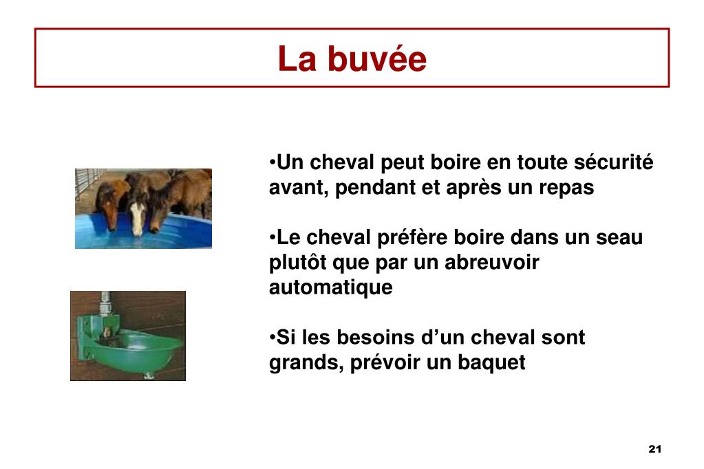 La buvée • Un cheval peut boire en toute sécurité avant, pendant et après un repas • Le cheval préfère boire dans un seau plutôt que par un abreuvoir automatique • Si les besoins d’un cheval sont grands, prévoir un baquet