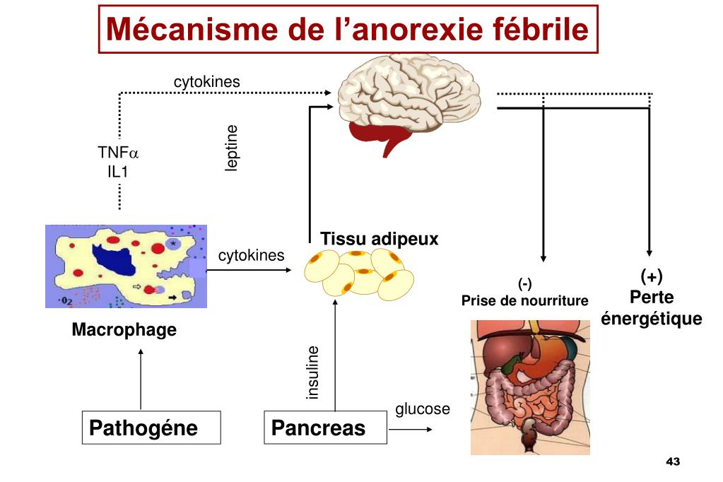 cytokines leptine TNF IL1 Tissu adipeux cytokines (+) Perte énergétique (-) Prise de nourriture Macrophage insuline glucose Pancreas Pathogéne Mécanisme de l’anorexie fébrile