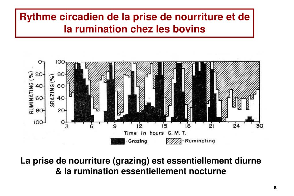 Rythme circadien de la prise de nourriture et de la rumination chez les bovins La prise de nourriture (grazing) est essentiellement diurne & la rumination essentiellement nocturne