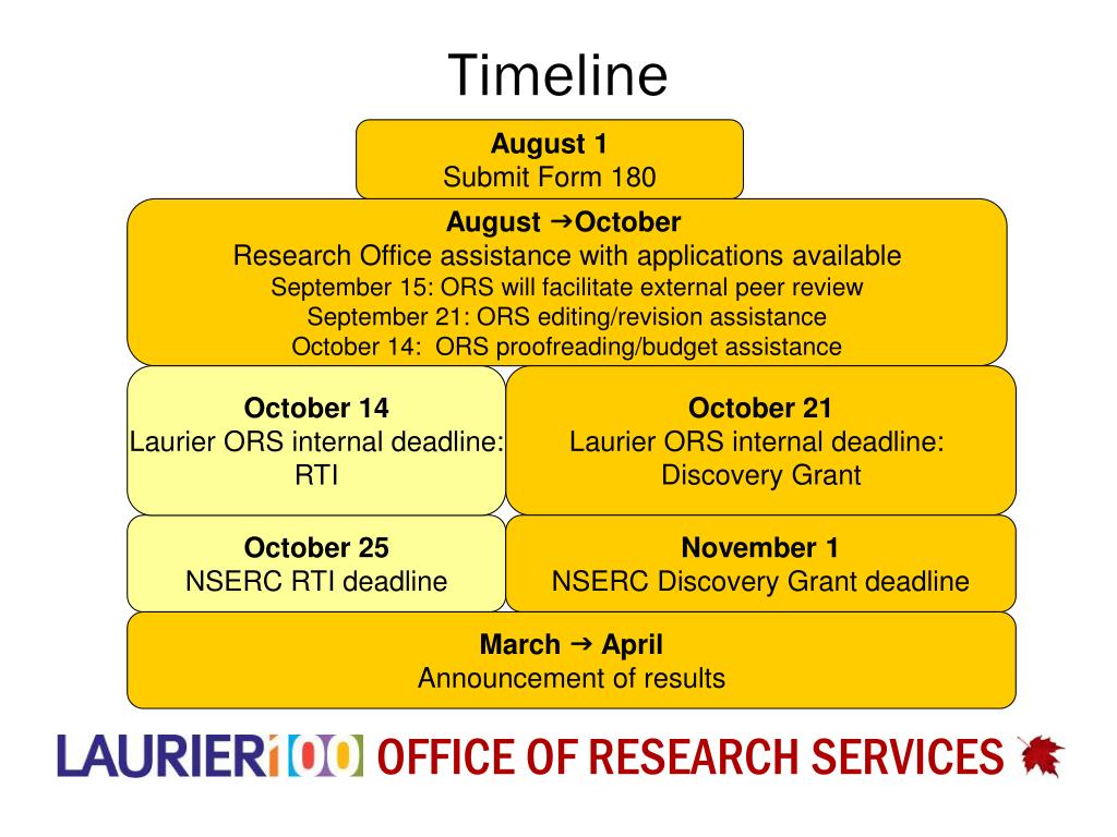 Timeline August 1 Submit Form 180 August OctoberResearch Office assistance with applications available September 15: ORS will facilitate external peer review September 21: ORS editing/revision assistance October 14: ORS proofreading/budget assistance October 14 Laurier ORS internal deadline: RTI October 21 Laurier ORS internal deadline: Discovery Grant October 25 NSERC RTI deadline November 1 NSERC Discovery Grant deadline March April Announcement of results