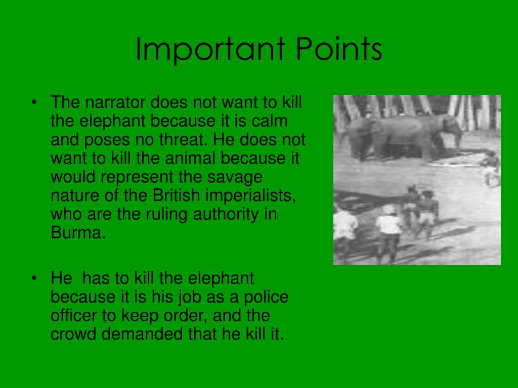 Important Points • The narrator does not want to kill the elephant because it is calm and poses no threat. He does not want to kill the animal because it would represent the savage nature of the British imperialists, who are the ruling authority in Burma. • He has to kill the elephant because it is his job as a police officer to keep order, and the crowd demanded that he kill it.