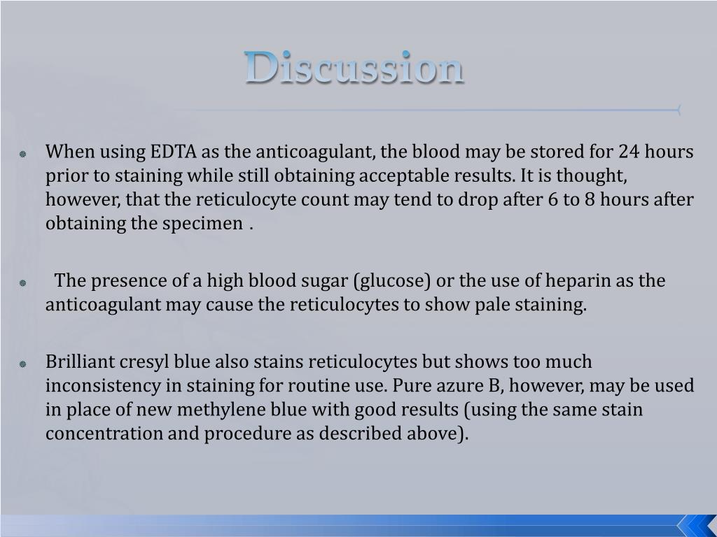 Discussion • When using EDTA as the anticoagulant, the blood may be stored for 24 hours prior to staining while still obtaining acceptable results. It is thought, however, that the reticulocyte count may tend to drop after 6 to 8 hours after obtaining the specimen. • The presence of a high blood sugar (glucose) or the use of heparin as the anticoagulant may cause the reticulocytes to show pale staining. • Brilliant cresyl blue also stains reticulocytes but shows too much inconsistency in staining for routine use. Pure azure B, however, may be used in place of new methylene blue with good results (using the same stain concentration and procedure as described above).