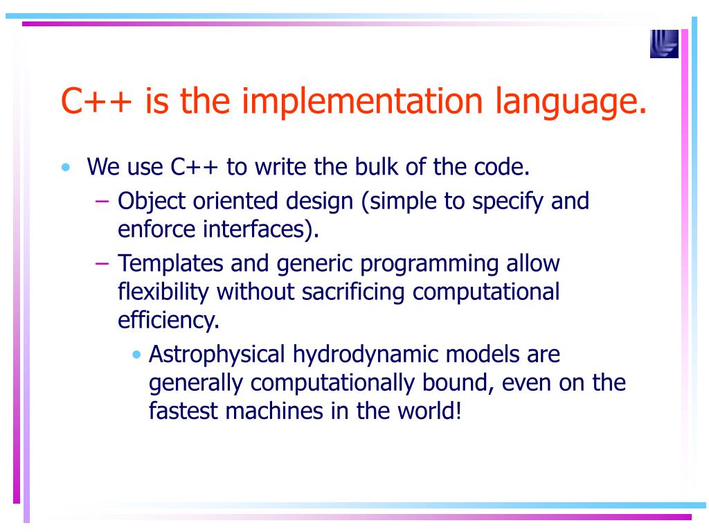 We use C++ to write the bulk of the code. Object oriented design (simple to specify and enforce interfaces). Templates and generic programming allow flexibility without sacrificing computational efficiency. Astrophysical hydrodynamic models are generally computationally bound, even on the fastest machines in the world! C++ is the implementation language.