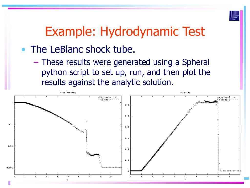Example: Hydrodynamic Test • The LeBlanc shock tube. • These results were generated using a Spheral python script to set up, run, and then plot the results against the analytic solution.