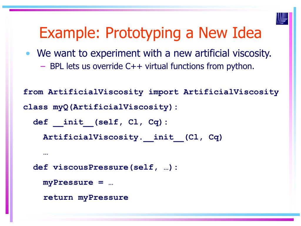 Example: Prototyping a New Idea • We want to experiment with a new artificial viscosity. • BPL lets us override C++ virtual functions from python. from ArtificialViscosity import ArtificialViscosity class myQ(ArtificialViscosity): def __init__(self, Cl, Cq): ArtificialViscosity.__init__(Cl, Cq) … def viscousPressure(self, …): myPressure = … return myPressure