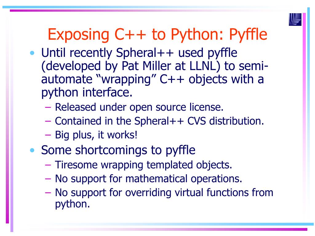 Exposing C++ to Python: Pyffle • Until recently Spheral++ used pyffle (developed by Pat Miller at LLNL) to semi-automate “wrapping” C++ objects with a python interface. • Released under open source license. • Contained in the Spheral++ CVS distribution. • Big plus, it works! • Some shortcomings to pyffle • Tiresome wrapping templated objects. • No support for mathematical operations. • No support for overriding virtual functions from python.
