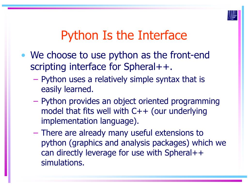 Python Is the Interface • We choose to use python as the front-end scripting interface for Spheral++. • Python uses a relatively simple syntax that is easily learned. • Python provides an object oriented programming model that fits well with C++ (our underlying implementation language). • There are already many useful extensions to python (graphics and analysis packages) which we can directly leverage for use with Spheral++ simulations.