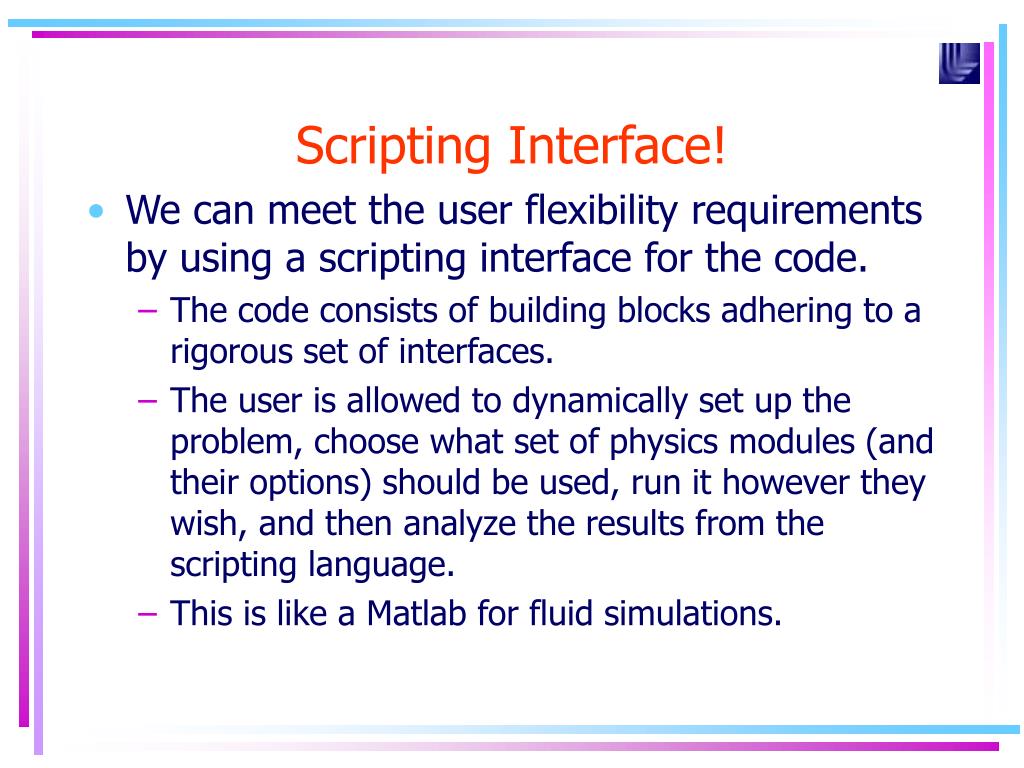 Scripting Interface! • We can meet the user flexibility requirements by using a scripting interface for the code. • The code consists of building blocks adhering to a rigorous set of interfaces. • The user is allowed to dynamically set up the problem, choose what set of physics modules (and their options) should be used, run it however they wish, and then analyze the results from the scripting language. • This is like a Matlab for fluid simulations.