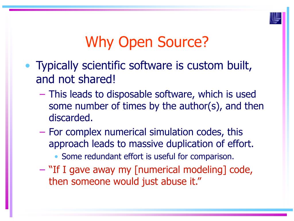 Why Open Source? • Typically scientific software is custom built, and not shared! • This leads to disposable software, which is used some number of times by the author(s), and then discarded. • For complex numerical simulation codes, this approach leads to massive duplication of effort. • Some redundant effort is useful for comparison. • “If I gave away my [numerical modeling] code, then someone would just abuse it.”