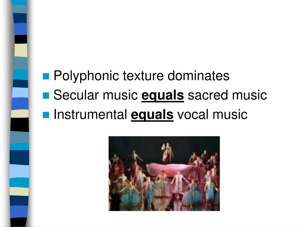 Polyphonic texture dominates • Secular music equals sacred music • Instrumental equals vocal music