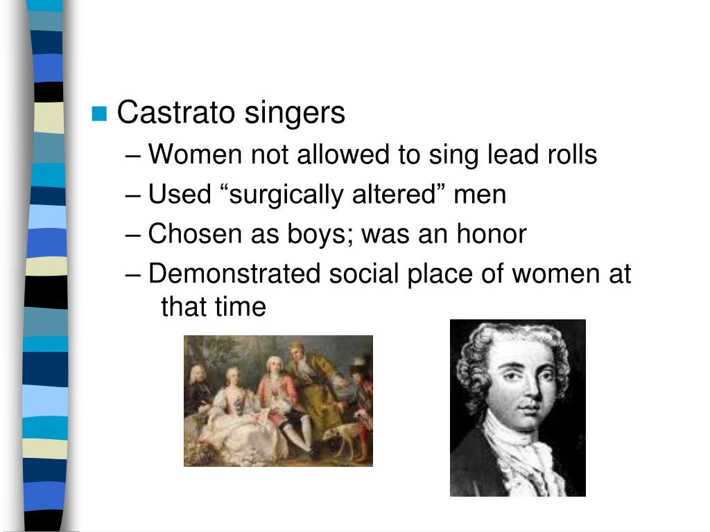 Castrato singers • Women not allowed to sing lead rolls • Used “surgically altered” men • Chosen as boys; was an honor • Demonstrated social place of women at that time