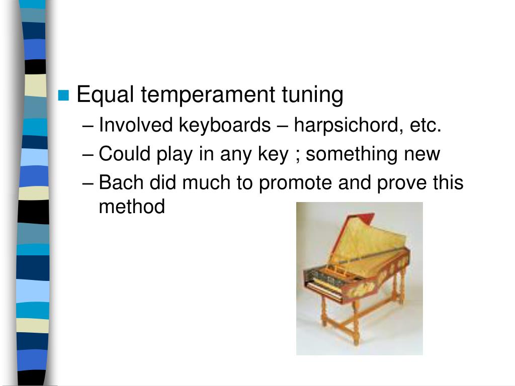 Equal temperament tuning • Involved keyboards – harpsichord, etc. • Could play in any key ; something new • Bach did much to promote and prove this method
