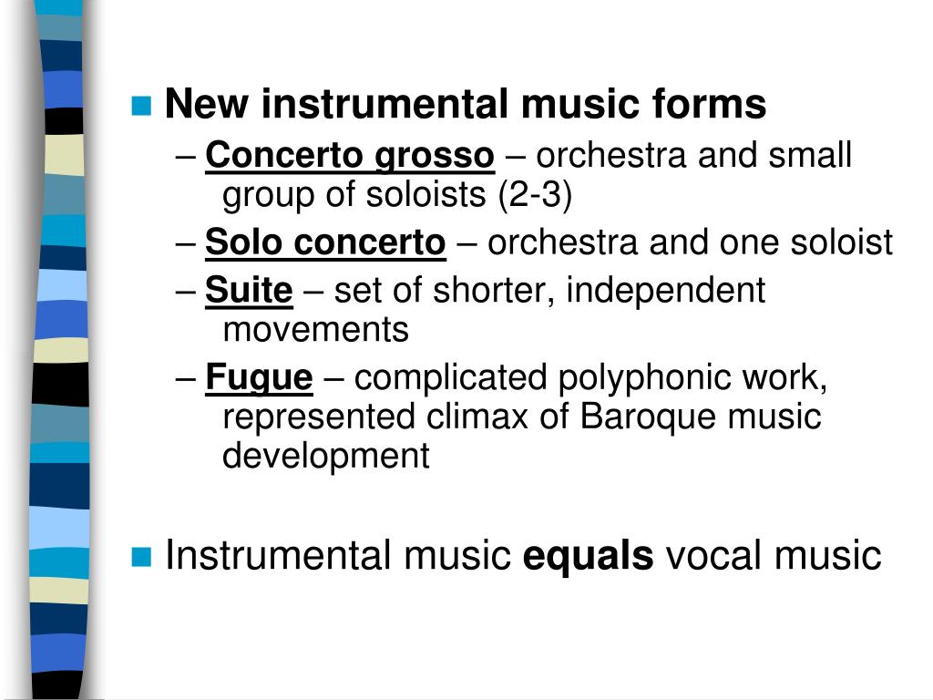 New instrumental music forms • Concerto grosso – orchestra and small group of soloists (2-3) • Solo concerto – orchestra and one soloist • Suite – set of shorter, independent movements • Fugue – complicated polyphonic work, represented climax of Baroque music development • Instrumental music equals vocal music