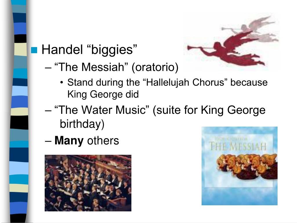 Handel “biggies” • “The Messiah” (oratorio) • Stand during the “Hallelujah Chorus” because King George did • “The Water Music” (suite for King George birthday) • Many others
