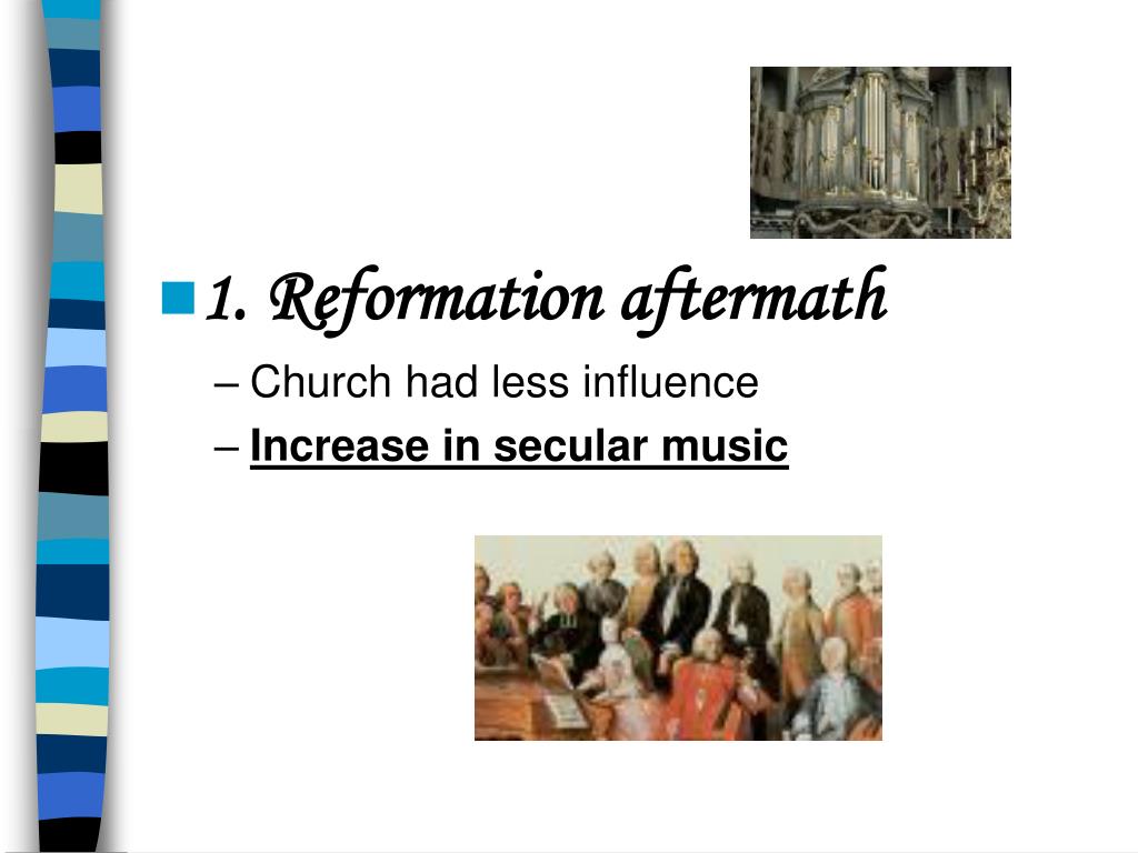 1. Reformation aftermath • Church had less influence • Increase in secular music