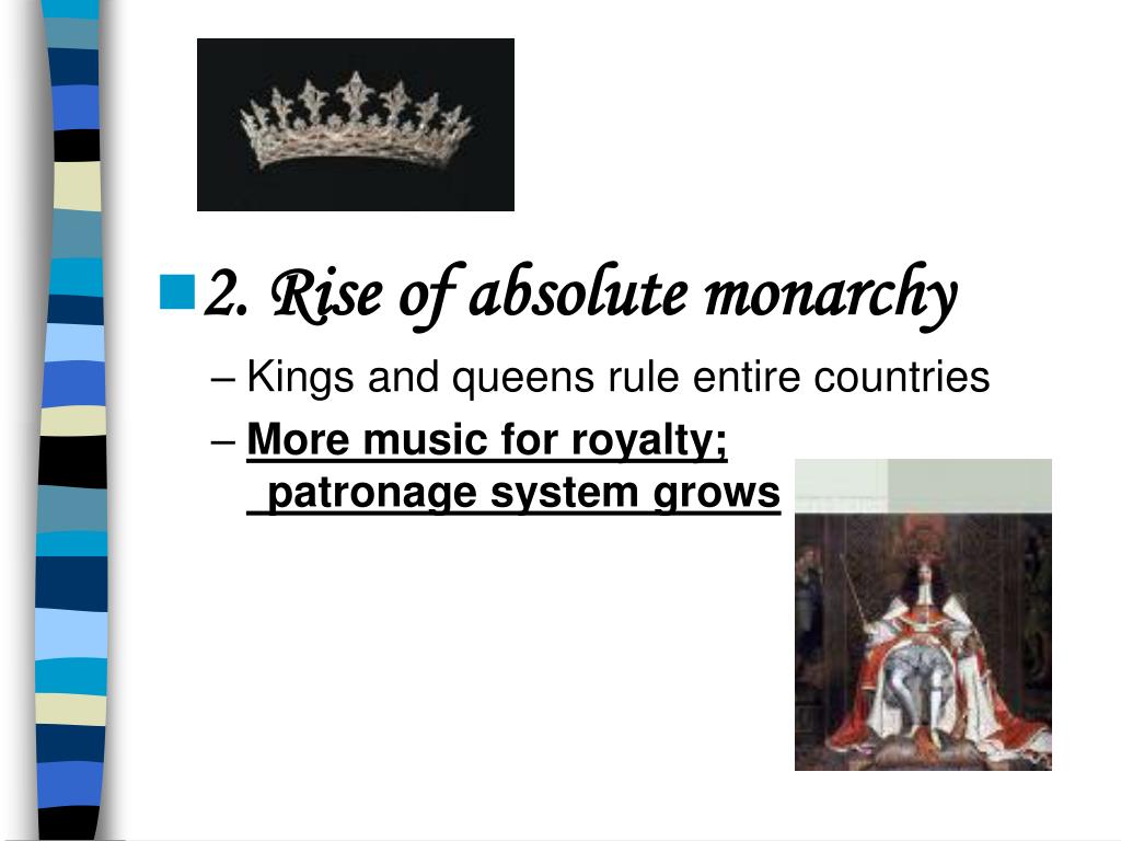 2. Rise of absolute monarchy • Kings and queens rule entire countries • More music for royalty; patronage system grows