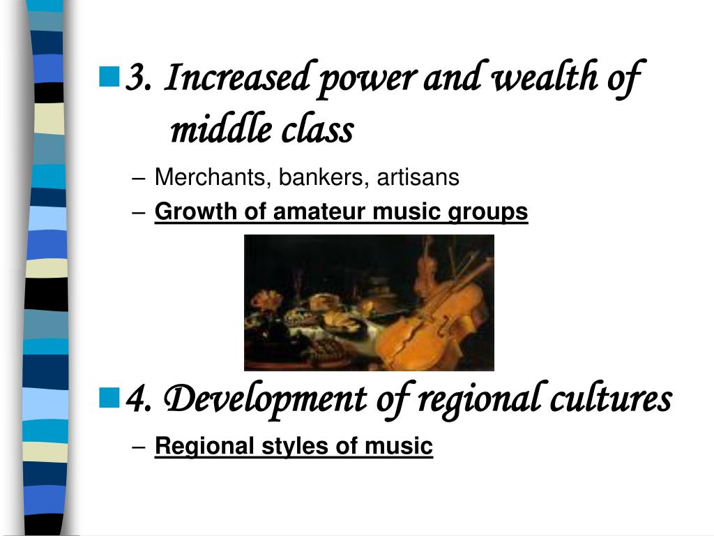 3. Increased power and wealth of middle class • Merchants, bankers, artisans • Growth of amateur music groups • 4. Development of regional cultures • Regional styles of music