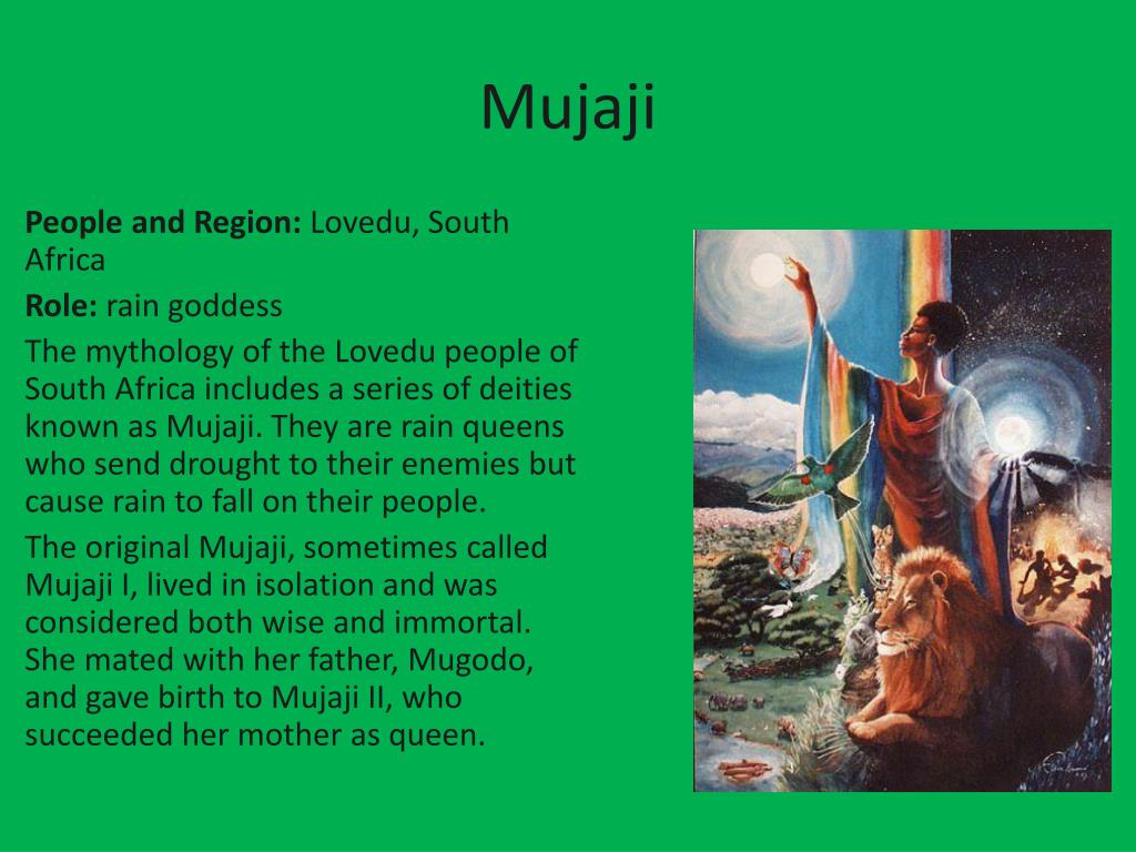 Mujaji People and Region: Lovedu, South Africa Role: rain goddess The mythology of the Lovedu people of South Africa includes a series of deities known as Mujaji. They are rain queens who send drought to their enemies but cause rain to fall on their people. The original Mujaji, sometimes called Mujaji I, lived in isolation and was considered both wise and immortal. She mated with her father, Mugodo, and gave birth to Mujaji II, who succeeded her mother as queen.