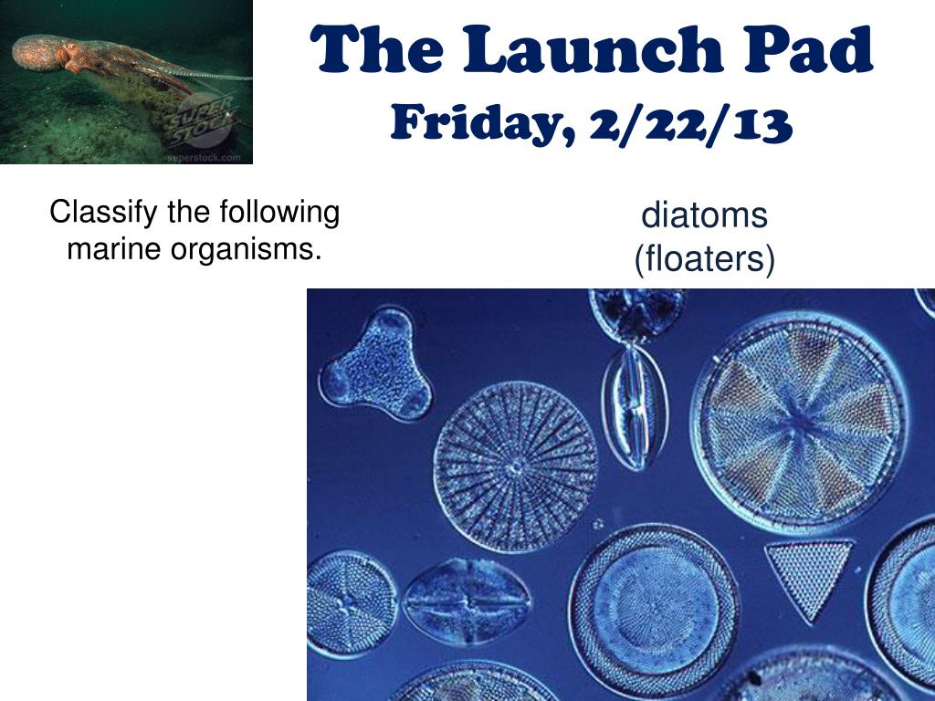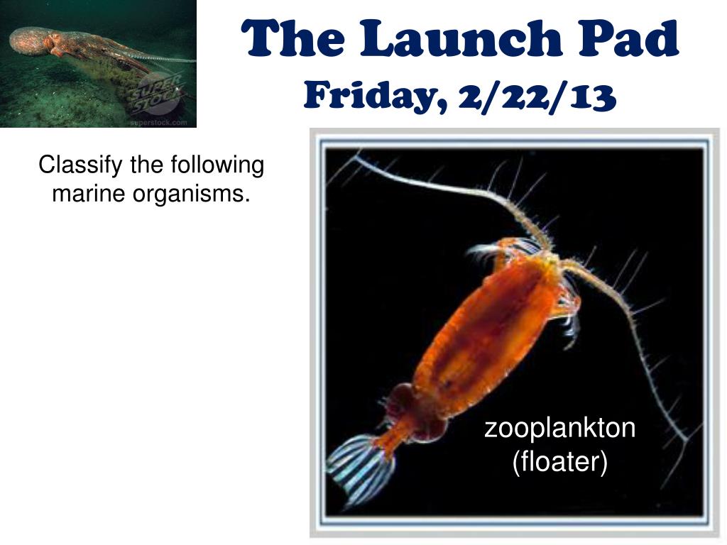 Friday February 22, 2013. ( Quiz 20 ). The Launch Pad Friday, 2/22/13. Classify the following marine organisms. zooplankton (floater). The Launch Pad Friday, 2/22/13. Classify the following marine organisms. diatoms (floaters). The Launch Pad Friday, 2/22/13.