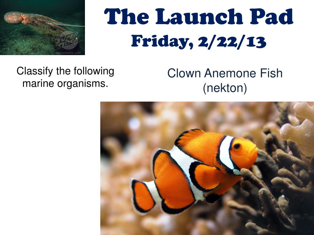 The Launch Pad Friday, 2/22/13 Classify the following marine organisms. Clown Anemone Fish (nekton)