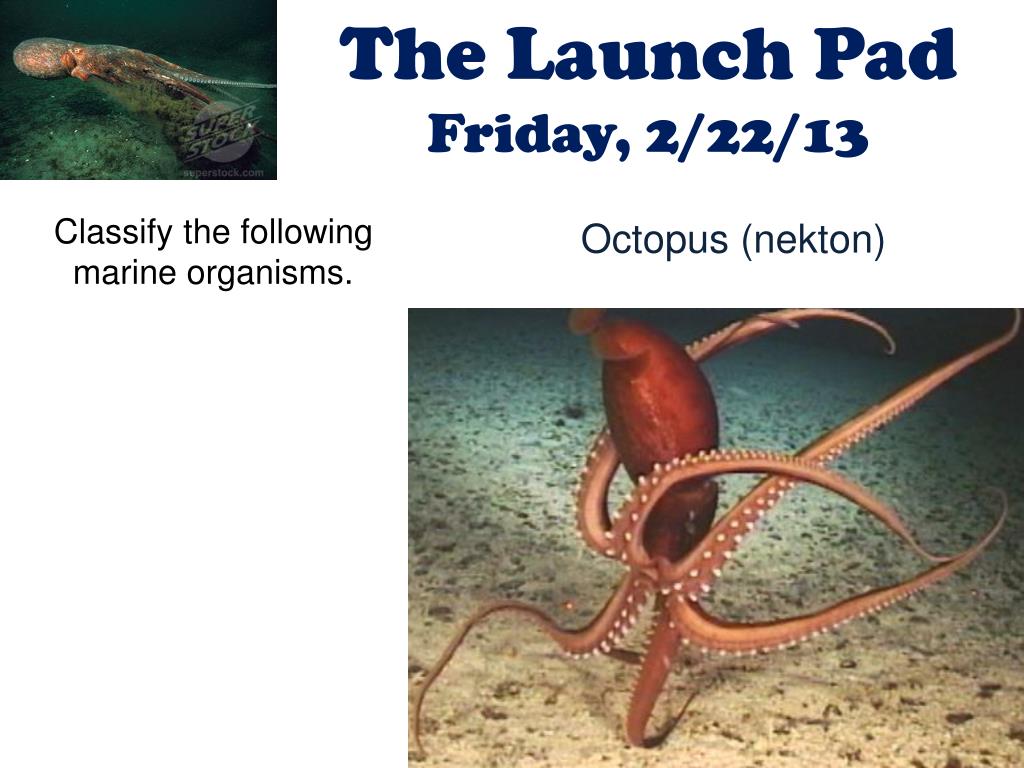 The Launch Pad Friday, 2/22/13 Classify the following marine organisms. Octopus (nekton)