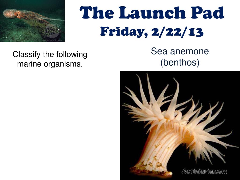 The Launch Pad Friday, 2/22/13 Sea anemone (benthos) Classify the following marine organisms.