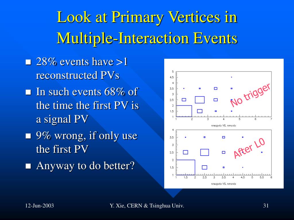 Look at Primary Vertices in Multiple-Interaction Events • 28% events have >1 reconstructed PVs • In such events 68% of the time the first PV is a signal PV • 9% wrong, if only use the first PV • Anyway to do better? No trigger After L0 Y. Xie, CERN & Tsinghua Univ.