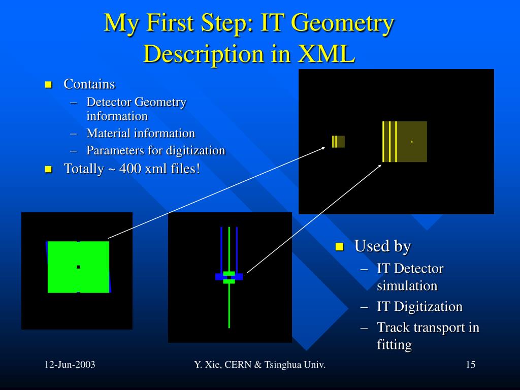 Contains Detector Geometry information Material information Parameters for digitization Totally ~ 400 xml files! Used by IT Detector simulation IT Digitization Track transport in fitting My First Step: IT Geometry Description in XML Y. Xie, CERN & Tsinghua Univ.