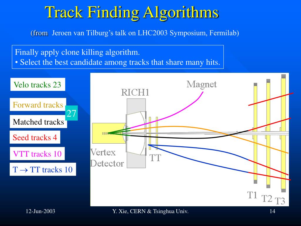 Track Finding Algorithms (fromJeroen van Tilburg’s talk on LHC2003 Symposium, Fermilab) Finally apply clone killing algorithm. • Select the best candidate among tracks that share many hits. Velo tracks 23 Forward tracks 27 Matched tracks Seed tracks 4 VTT tracks 10 T TT tracks 10 Y. Xie, CERN & Tsinghua Univ.
