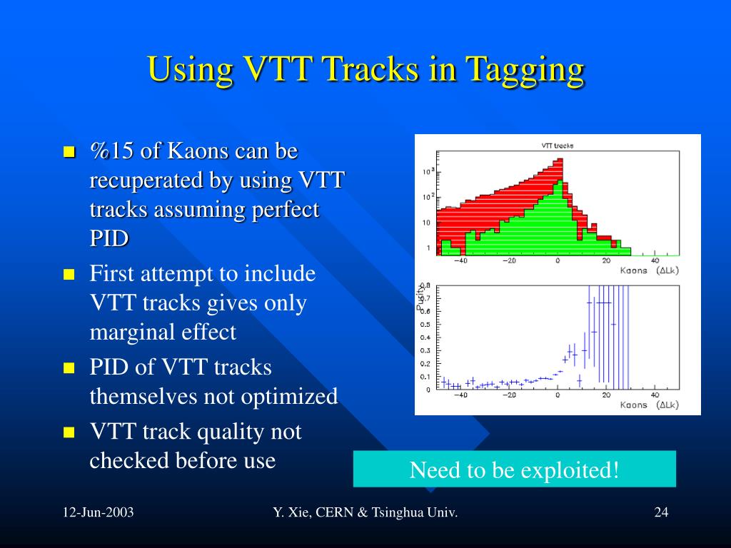 %15 of Kaons can be recuperated by using VTT tracks assuming perfect PID First attempt to include VTT tracks gives only marginal effect PID of VTT tracks themselves not optimized VTT track quality not checked before use Using VTT Tracks in Tagging Need to be exploited! Y. Xie, CERN & Tsinghua Univ.