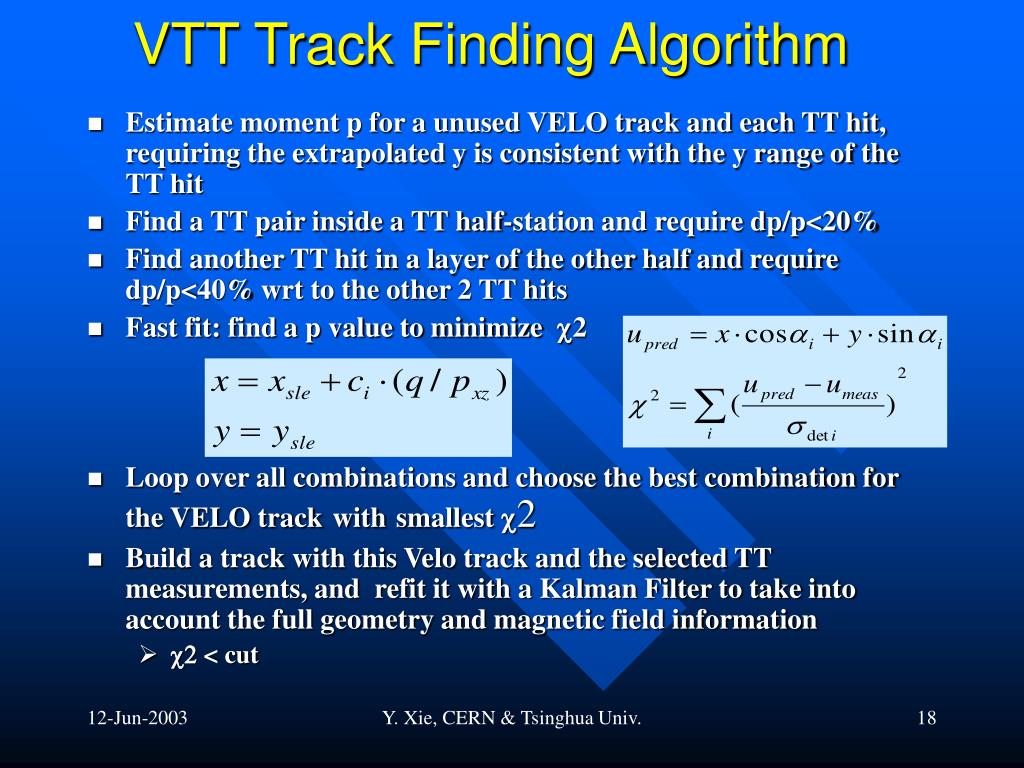 VTT Track Finding Algorithm • Estimate moment p for a unused VELO track and each TT hit, requiring the extrapolated y is consistent with the y range of the TT hit • Find a TT pair inside a TT half-station and require dp/p<20% • Find another TT hit in a layer of the other half and require dp/p<40% wrt to the other 2 TT hits • Fast fit: find a p value to minimize c2 • Loop over all combinations and choose the best combination for the VELO trackwithsmallest c2 • Build a track with this Velo track and the selected TT measurements, and refit it with a Kalman Filter to take into account the full geometry and magnetic field information • c2 < cut Y. Xie, CERN & Tsinghua Univ.