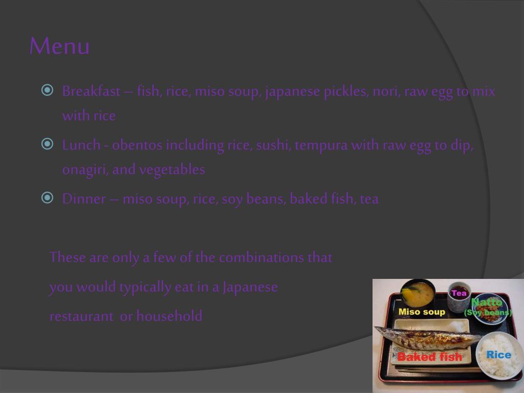 Menu • Breakfast – fish, rice, miso soup, japanesepickles, nori, raw egg to mix with rice • Lunch - obentos including rice, sushi, tempura with raw egg to dip, onagiri, and vegetables • Dinner – miso soup, rice, soy beans, baked fish, tea These are only a few of the combinations that you would typically eat in a Japanese restaurant or household