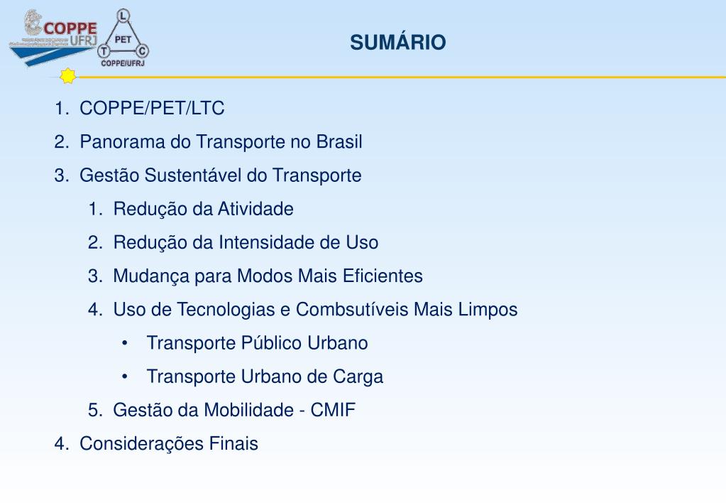 SUMÁRIO • COPPE/PET/LTC • Panorama do Transporteno Brasil • GestãoSustentável do Transporte • Redução da Atividade • Reduçãoda Intensidade de Uso • MudançaparaModosMaisEficientes • Uso de Tecnologias e CombsutíveisMaisLimpos • TransportePúblicoUrbano • TransporteUrbano de Carga • Gestão da Mobilidade - CMIF • ConsideraçõesFinais