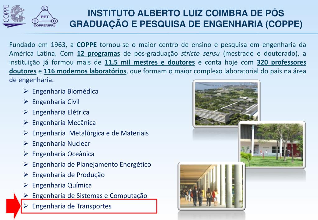 INSTITUTO ALBERTO LUIZ COIMBRA DE PÓS GRADUAÇÃO E PESQUISA DE ENGENHARIA (COPPE) Fundado em 1963, a COPPE tornou-se o maior centro de ensino e pesquisa em engenharia da América Latina. Com 12 programasde pós-graduação strictosensu(mestrado e doutorado), a instituição já formou mais de 11,5 mil mestres e doutorese conta hoje com 320 professores doutorese 116 modernos laboratórios, que formam o maior complexo laboratorial do país na área de engenharia. • Engenharia Biomédica • Engenharia Civil • Engenharia Elétrica • Engenharia Mecânica • Engenharia Metalúrgica e de Materiais • Engenharia Nuclear • Engenharia Oceânica • Engenharia de Planejamento Energético • Engenharia de Produção • Engenharia Química • Engenharia de Sistemas e Computação • Engenharia de Transportes