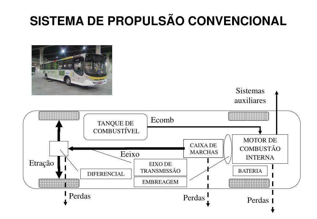 Sistemas auxiliares Ecomb TANQUE DE COMBUSTÍVEL MOTOR DE COMBUSTÃO INTERNA CAIXA DE MARCHAS Eeixo Etração EIXO DE TRANSMISSÃO BATERIA DIFERENCIAL EMBREAGEM Perdas Perdas Perdas SISTEMA DE PROPULSÃO CONVENCIONAL
