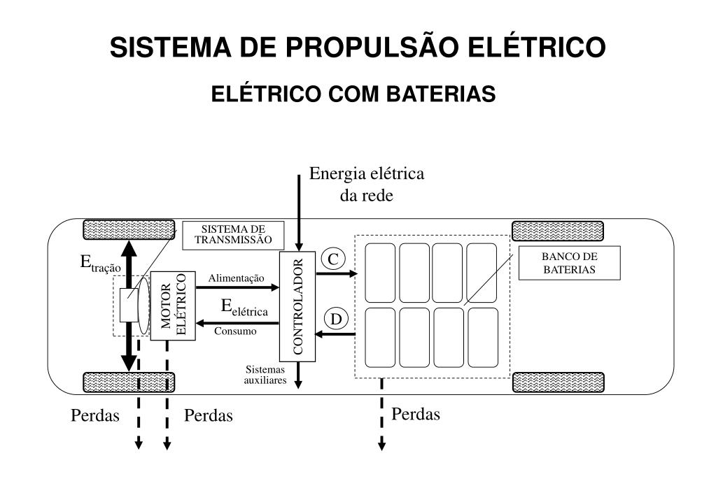SISTEMA DE PROPULSÃO ELÉTRICO ELÉTRICO COM BATERIAS Energia elétrica da rede SISTEMA DE TRANSMISSÃO BANCO DE BATERIAS Etração C Alimentação MOTOR ELÉTRICO CONTROLADOR Eelétrica D Consumo Sistemas auxiliares Perdas Perdas Perdas