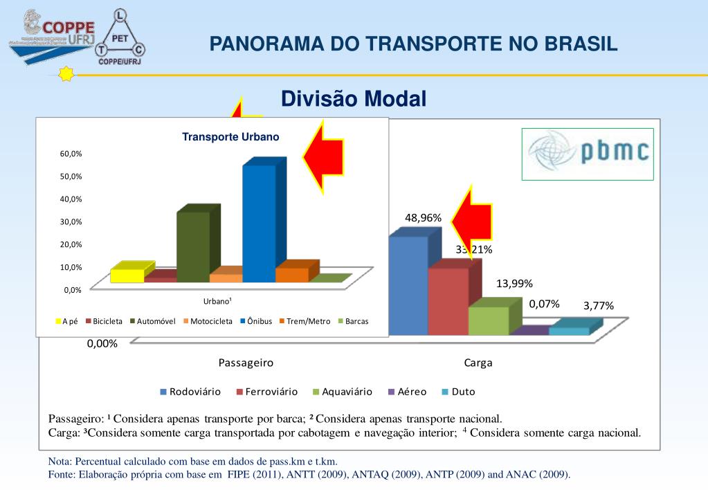PANORAMA DO TRANSPORTE NO BRASIL Divisão Modal TransporteUrbano Nota: Percentualcalculado com base em dados de pass.km e t.km. Fonte: Elaboraçãoprópria com base em FIPE (2011), ANTT (2009), ANTAQ (2009), ANTP (2009) and ANAC (2009).