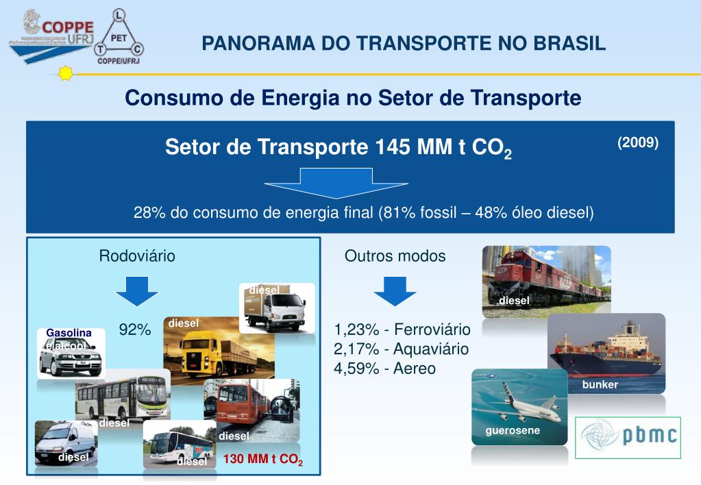 CONSIDERAÇÕES FINAIS O Brasil é líder mundial no uso de biocombustíveis para transporte e tem feito disso um exemplo; O Brasil tem um conjunto amplo de oportunidades para desenvolver e aplicar tecnologias associadas a fontes de energia mais limpas; Em futuro próximo um conjunto ainda maior de práticas, tecnologias e fontes de energia mais limpas entrarão no mercado brasileiro; O Programa de Engenharia de Transportes da COPPE/UFRJ tem estado engajado na missão de apoiar estas práticas e vencer os desafios que ainda teremos que enfrentar.