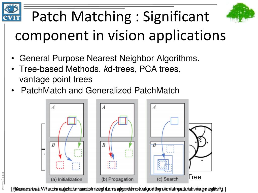Patch Matching : Significantcomponent in vision applications • General Purpose Nearest Neighbor Algorithms. • Tree-based Methods. kd-trees, PCA trees, vantage point trees • PatchMatch and Generalized PatchMatch (a) kd-Tree (c) vp-Tree (b) PCA Tree [Kumar et al. What is a good nearest neighbors algorithm for finding similar patches in images?] [Barnes et al. Patchmatch: a randomized correspondence algorithm for structural image editing.]