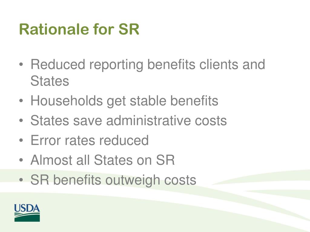Rationale for SR • Reduced reporting benefits clients and States • Households get stable benefits • States save administrative costs • Error rates reduced • Almost all States on SR • SR benefits outweigh costs