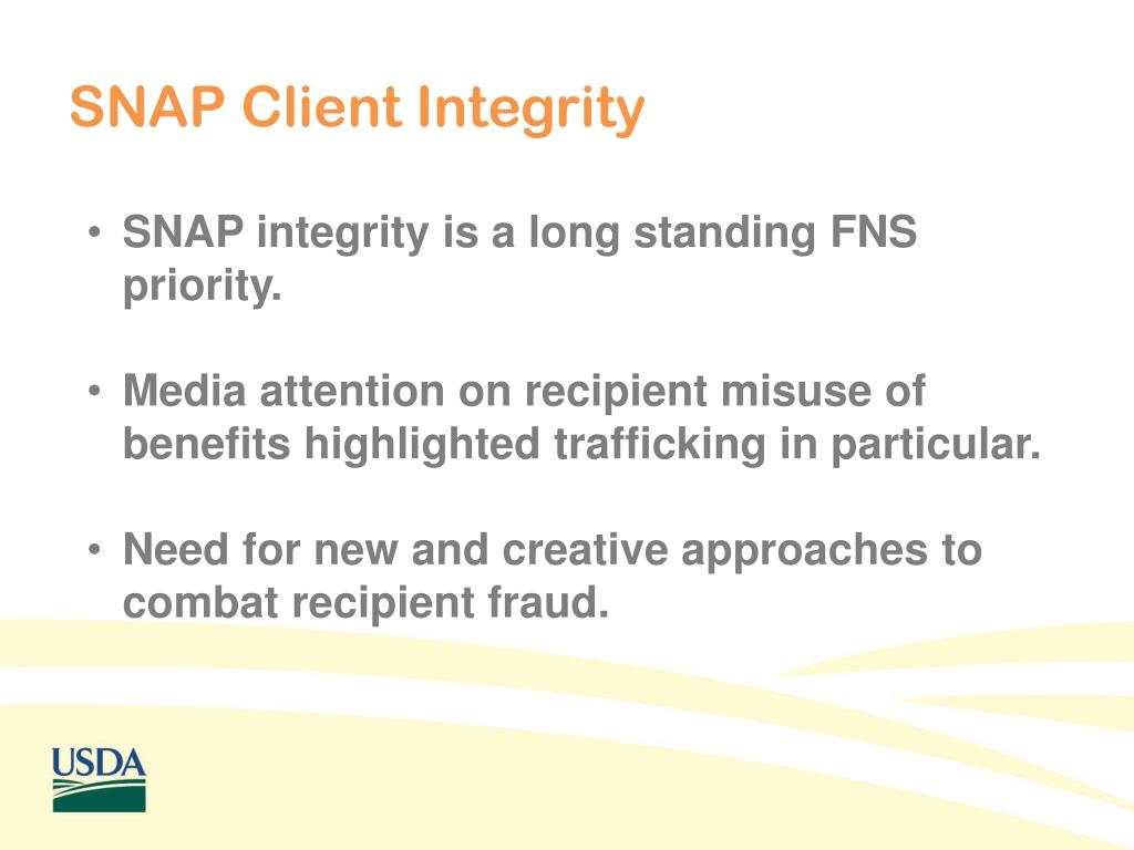 SNAP Client Integrity • SNAP integrity is a long standing FNS priority. • Media attention on recipient misuse of benefits highlighted trafficking in particular. • Need for new and creative approaches to combat recipient fraud.