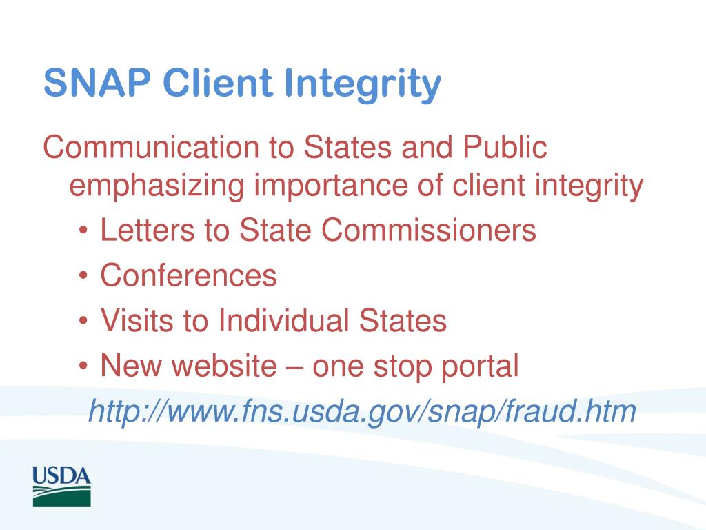 SNAP Client Integrity Communication to States and Public emphasizing importance of client integrity • Letters to State Commissioners • Conferences • Visits to Individual States • New website – one stop portal http://www.fns.usda.gov/snap/fraud.htm