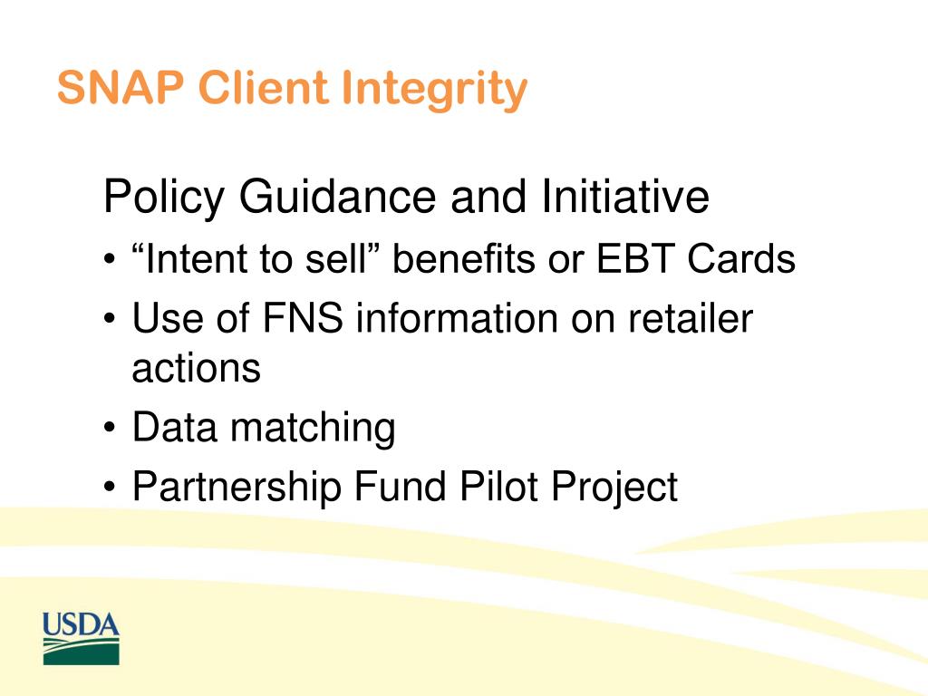SNAP Client Integrity Policy Guidance and Initiative • “Intent to sell” benefits or EBT Cards • Use of FNS information on retailer actions • Data matching • Partnership Fund Pilot Project
