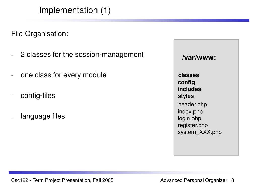 Implementation (1) • File-Organisation: • 2 classes for the session-management • one class for every module • config-files • language files /var/www: classes config includes styles header.php index.php login.php register.php system_XXX.php Csc122 - Term Project Presentation, Fall 2005 Advanced Personal Organizer 8